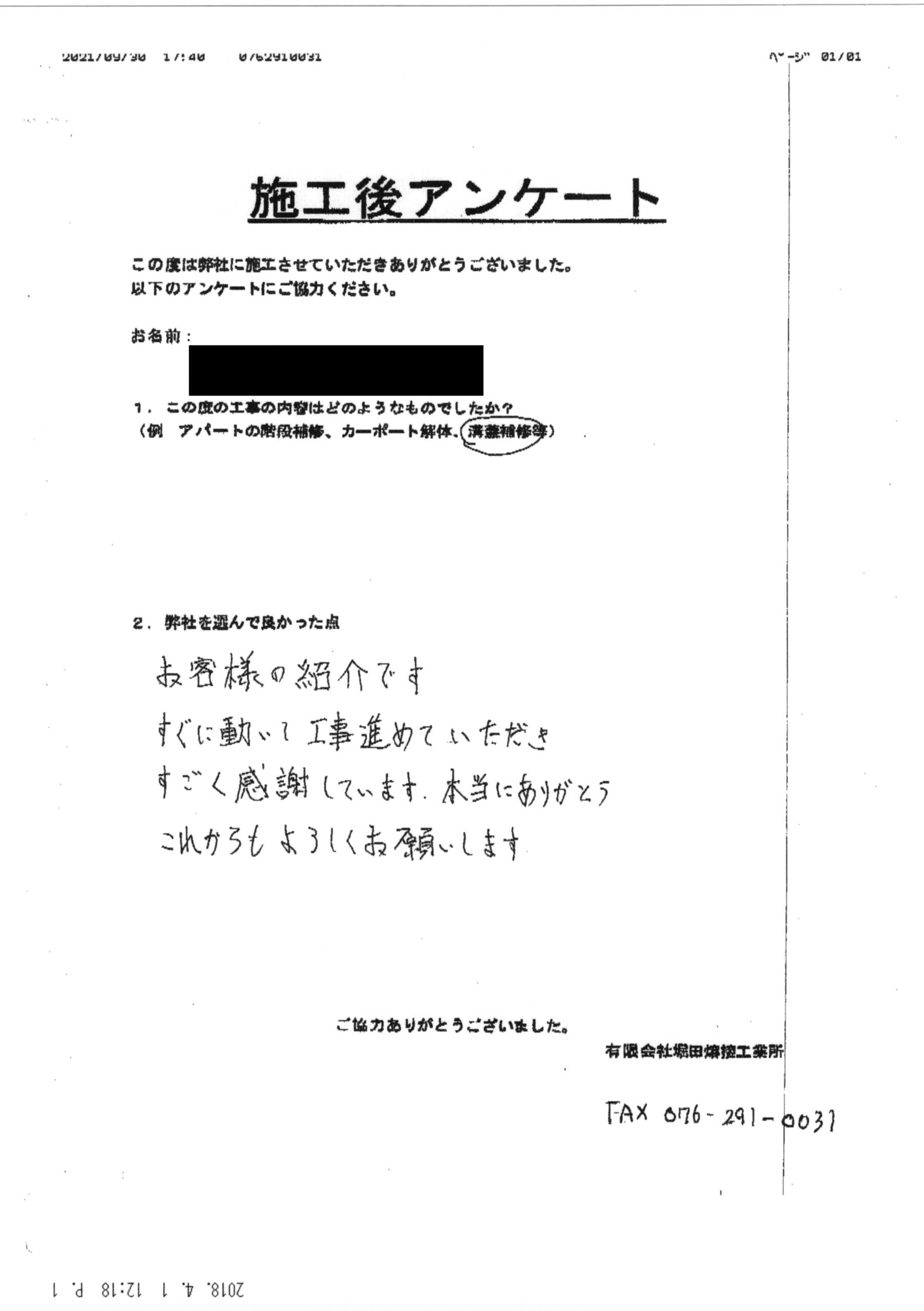 お客様の紹介です。すぐに動いて工事進めていただき、すごく感謝しています。本当にありがとう。これからもよろしくお願いします。