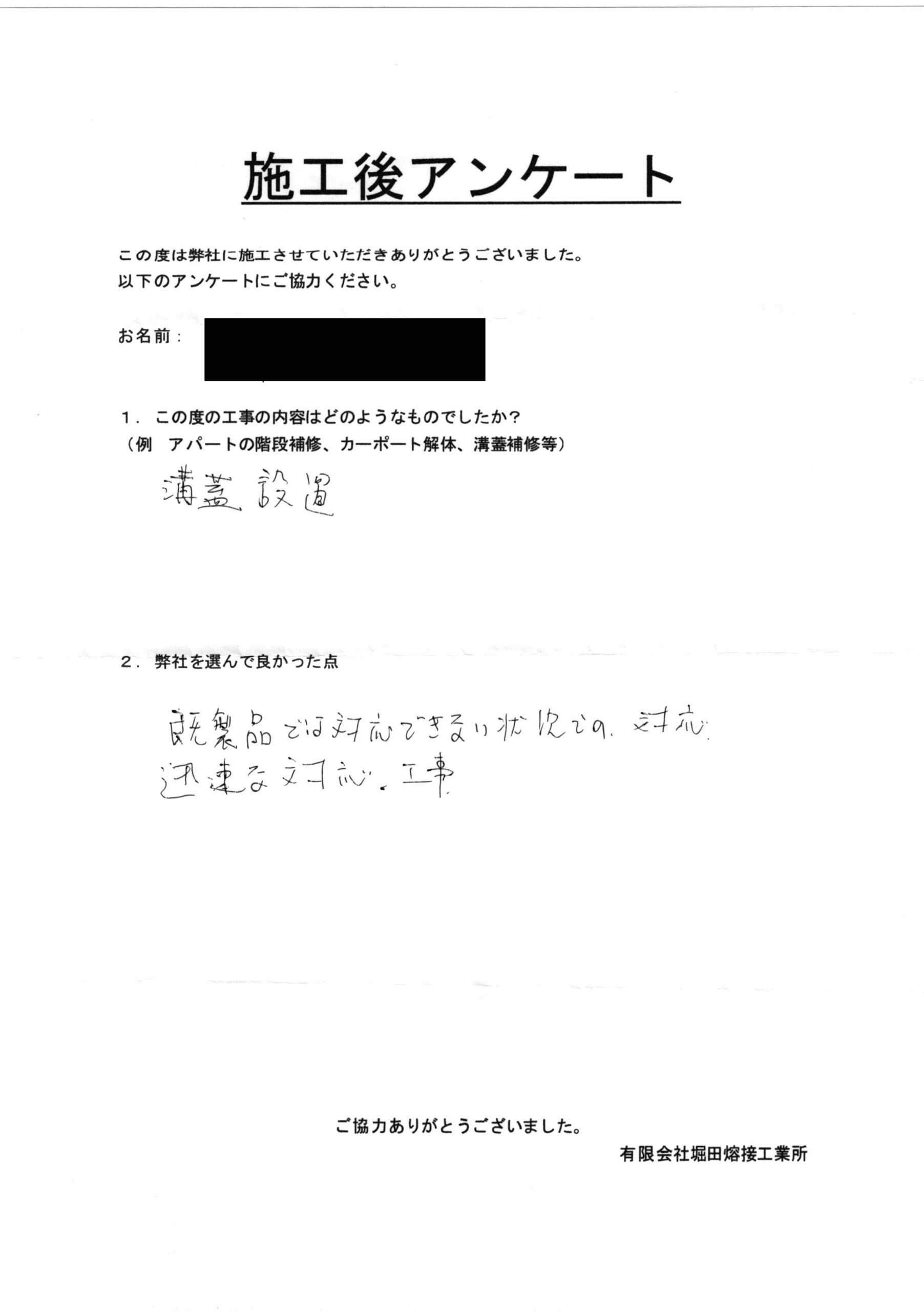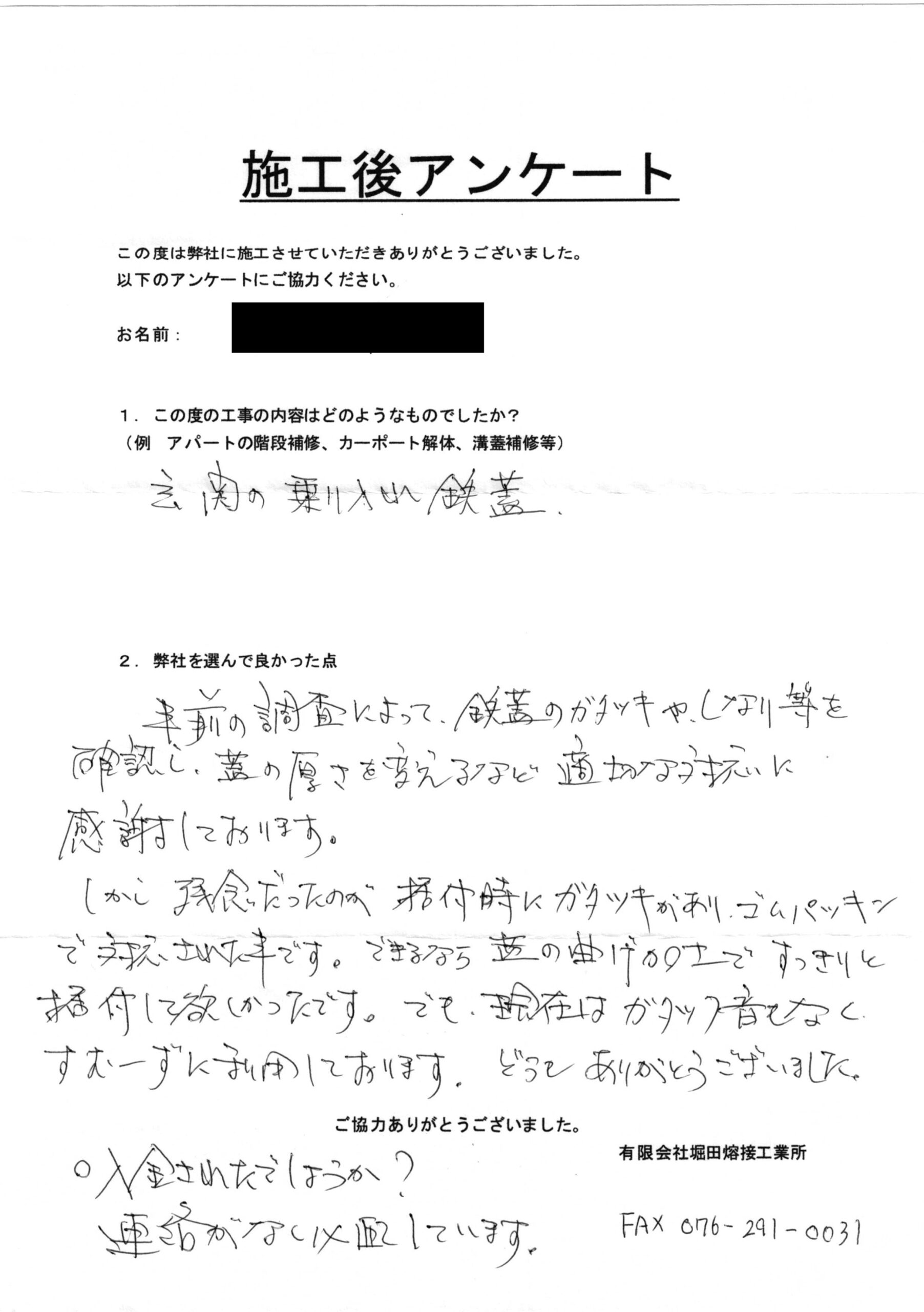 事前の調査によって、鉄蓋のガタツキやしなり等を確認し、蓋の厚さを変えるなど、適切な対応に感謝しております。しかし残念だったのが、据付時にガタツキがあり、ゴムパッキンで対応された事です。できるなら蓋の曲げ加工ですっきりと据付して欲しかったです。でも現在はガタツク音もなくスムーズに利用しております。どうもありがとうございました。