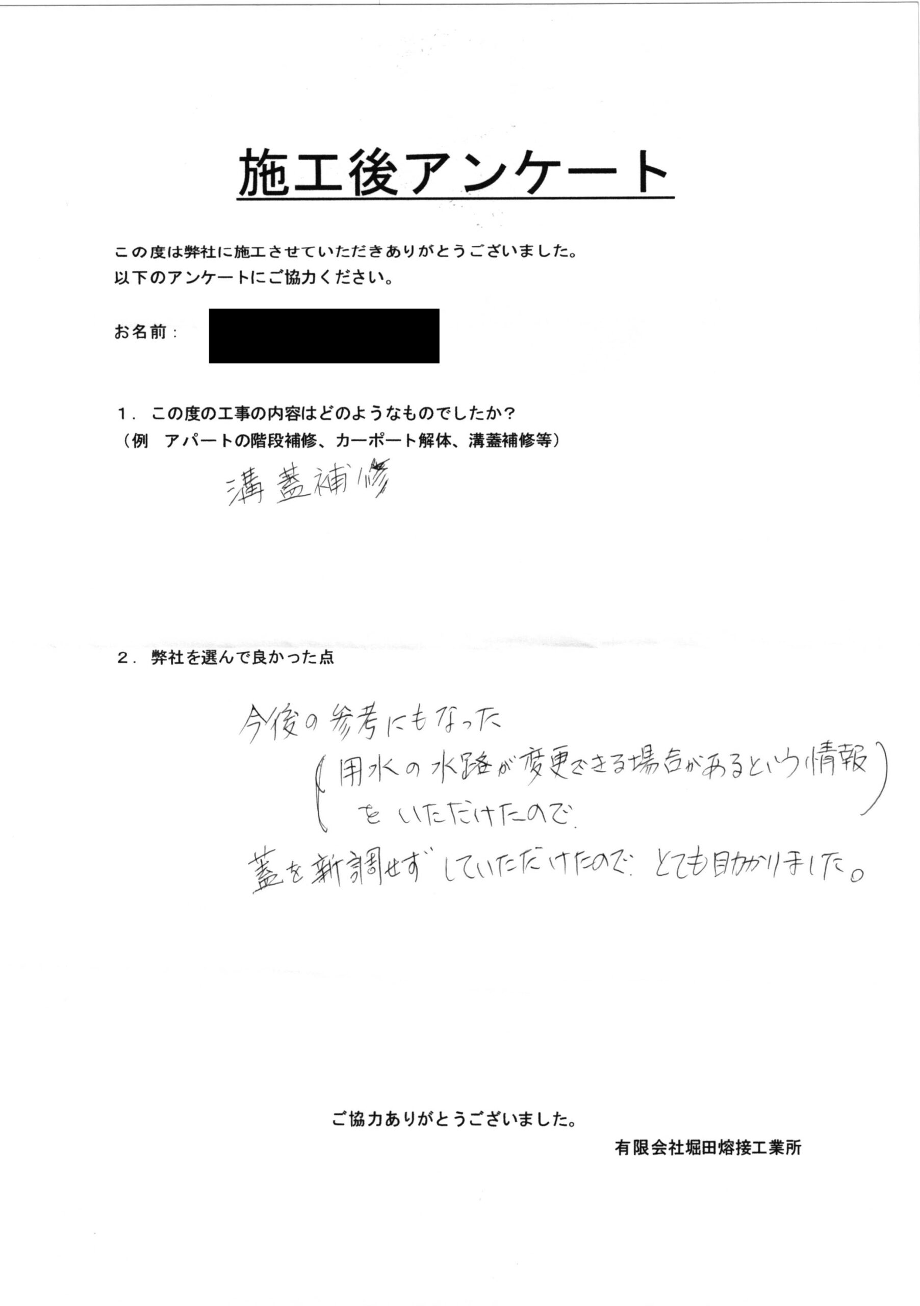 今後の参考にもなった(用水の水路が変更できる場合があるという情報をいただけたので)蓋を新調せずしていただけたので、とても助かりました。